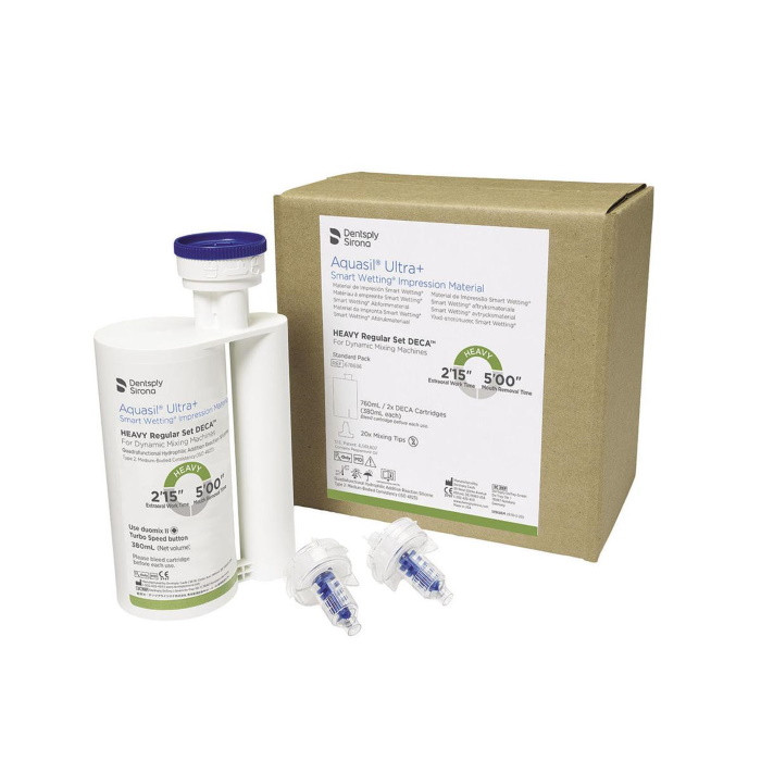 Materiale da impronta ideale in ogni fase di realizzazione del ma"nufatto protesico; offre la più al -ta idrocompatibilità intraorale del materiale polimerizzato garantendo una maggiore accuratezza dell'impronta e la più alta resistenza allo strappo intraorale dopo 24 ore per una maggiore precisione. Stabilità dimensionale 15 giorni. Aroma menta. Viscosità heavy, presa regular. Confezione: 4 cartucce da 50ml cad.,l2 puntali miscelatori blu.