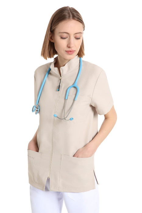 La casacca NEXT ha una linea pratica e dinamica collo alto, zip intera con doppio cursore, spacchetti laterali, due tasche capienti di cui una a dx con vani porta penne ed un comodo taschino. In microfibra (100% poliestere), completamente no stiro, lavabile in candeggina anti-batterica, 9 colori brillanti in tinta unita. Lavabile a 90°. Casacca unisex beige, manica corta, taglia 3XL.