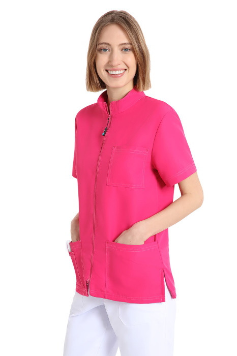 La casacca NEXT ha una linea pratica e dinamica collo alto, zip intera con doppio cursore, spacchetti laterali, due tasche capienti di cui una a dx con vani porta penne ed un comodo taschino. In microfibra (100% poliestere), completamente no stiro, lavabile in candeggina anti-batterica, 9 colori brillanti in tinta unita. Lavabile a 90°. Casacca unisex pink, manica corta, taglia S. Se desideri personalizzare il prodotto contatta il tuo agente, chiama il numero verde 800 751003 o scrivi a teleselling@dentaltrey. it