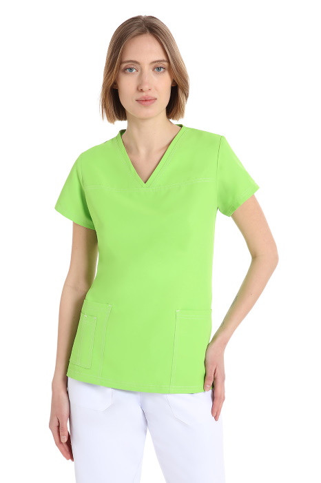 La casacca POWER modello donna ha una linea aderente, collo a V, cucitura orizzontale sopra il petto, due tasche a doppia cucitura e spacchetti laterali. In microfibra (100% poliestere), completamente no stiro, lavabile in candeggina anti-batterica, 9 colori brillanti in tinta unita. Lavabile a 90°. Casacca da donna verde mela manica corta, taglia L. Se desideri personalizzare il prodotto contatta il tuo agente, chiama il numero verde 800 751003 o scrivi a teleselling@dentaltrey. it.