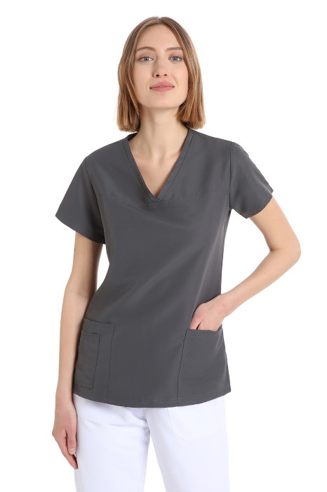 La casacca POWER modello donna ha una linea aderente, collo a V, cucitura orizzontale sopra il petto, due tasche a doppia cucitura e spacchetti laterali. In microfibra (100% poliestere), completamente no stiro, lavabile in candeggina anti-batterica, 9 colori brillanti in tinta unita. Lavabile a 90°. Casacca da donna grigia manica corta, taglia XL. Se desideri personalizzare il prodotto contatta il tuo agente, chiama il numero verde 800 751003 o scrivi a teleselling@dentaltrey. it.