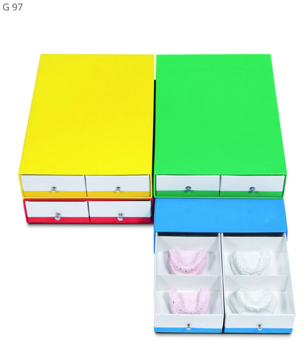 Cassettiera per modelli per ortodonzia e implantologia. Realizzato in cartone accoppiato, fornito con 2 cassetti per struttura. Dimensioni 21x32 h.6 cm. Colore verde.