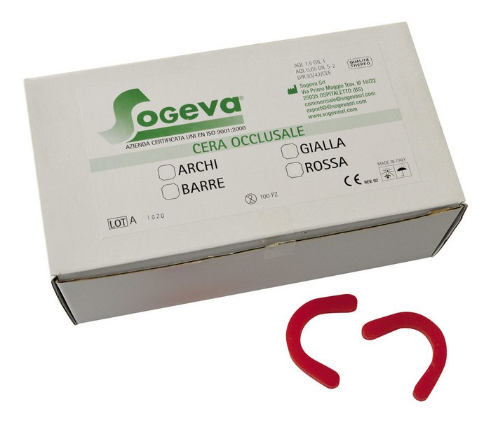Cera preformata per la preparazione in laboratorio, di archi occlus su basi in resina o base-plate. Id eale in studio, per la registraz e occlusale di segmenti parziali e per registrazioni del morso con o facciale di trasferimento. Colore rossa - consistenza dura - 100