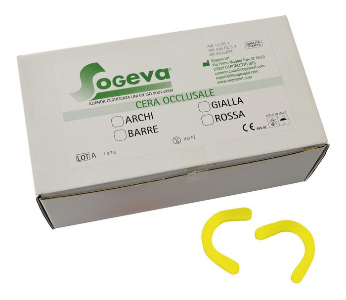 Cera preformata per la preparazione in laboratorio, di archi occlus su basi in resina o base-plate. Id eale in studio, per la registraz e occlusale di segmenti parziali e per registrazioni del morso con o facciale di trasferimento. Colore gialla - consistenza media - 10z z