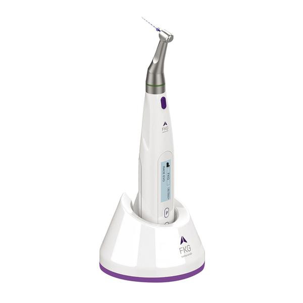 Motore endodontico cordless, con localizzatore apicale integrato che consente di lavorare sia con sistemi in modalità rotativa che con sistemi reciprocanti. È possibile impostare torque e velocità e programmi predefiniti e personalizzabili. Contrangolo con rotazione a 360° e rapporto 16:1. CARATTERISTI CHE E DATI TECNICI: Velocità rpm e torque selezionabili e variabili - Velocità: minima da 150 a 1.000 rpm max - Torque: da 0.6 a 3.5 Ncm - Movimento reciprocante programmabile - 3 modalità di lavoro per una massima efficienza: Modalità solo motore endodontico, Modalità rilevatore d'apice e Modalità simultanea motore e rilevatore d'apice. Programmi inseriti per strumenti FKG (RACE EVO, R-Motion e XP-endo). Funzione auto reverse. La confezione contiene: manipolo con contrangolo 16:1, base di ricarica, 1 tester, 2 cavi di prova (A e B), 2clip porta-files, 4 clip labiali, dispositivo d'illuminazione LED e 2guaine protettive.