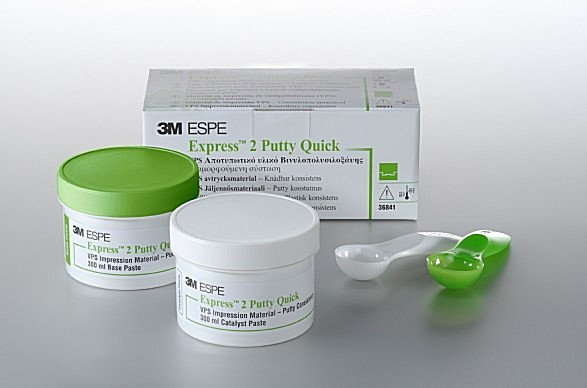 Materiale da impronta in vinipolisi lossano per tecnica simultanea, dop pia impronta (bifase) da utilizzare in abbinamento a Express 2 Regular Body Quick. Per miscelazione manua le. Presenta: alti valori di idrofilia, resistenza alla trazione, allungamento, tenacità e recupero dell'al lungamento che permettono la rimozione dell'impronta dalla bocca sen za distorsioni. Viscosità putty, presa rapida. La confezione contiene: 1 barattolo di pasta base da 300ml, 1 barattolo di catalizzatore da 300ml, 2 misuri ni - Colore verde