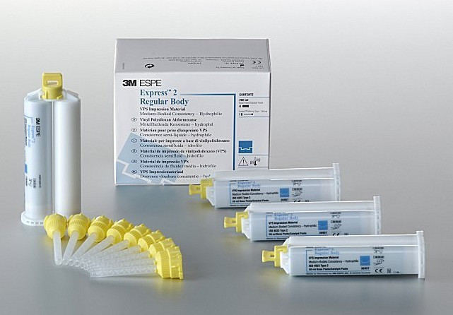 Materiale da impronta in polivinil silossano, ideale per essere utiliz zato in combinazione con Express 2 Putty Soft, per tecnica simultanea e doppia impronta, per miscelazione con dispenser. Colore verde petrolio. Viscosità regular, presa regu lar. La confezione contiene: 4 cartucce di Express 2 Regular Body da 50ml +10 puntali miscelatori Garant gial li.