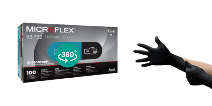 Guanti in nitrile disegnati con speciale tecnologia ERGOFORM in grado di proteggere dai disordini muscolo-scheletrici e dall'affaticamento della mano. Confezione da 100 pz, misura XL. Colore nero.