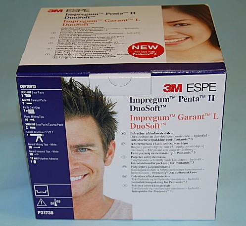 Materiale per impronta di precisio ne a base di polietere per l'applicazione della tecnica simultanea, per il sistema Pentamix 3 a miscela zione e dosaggio automatici. Indica to per corone e ponti, inlay e onlay, impronte funzionali. Viscosità heavy. Il kit contiene: 1 pasta base da 300ml, 1 catalizzatore da 60ml, 1cartuccia x Impregum Penta H DuoSof t, 10 puntali miscelatori Penta, 2 cartucce Garant da 50 ml, 10 punt ali miscelatori bianchi Garant, 10 terminali intraorali bianchi Gar ant, 1 flacone di adesivo per polieteri da 17 ml