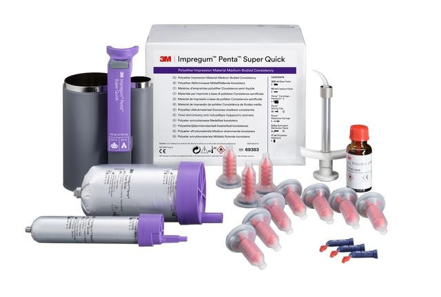 Materiale da impronta in polietere che unisce le prestazioni e l'affidabilità di un polietere alla velocità di un VPS. Garantisce un indurimento super rapido con tempo di lavorazione di 45 secondi e indurimento intraorale rapido di 2minuti. Ideale per impronte di corone singole, impianti, inlay, on lay e piccoli ponti fino a 3elementi. Viscosità Medium Body per tecnica d'impronta monofase e 1step double mix (miscelazione autom atica). La confezione comprende 1 pasta bas e da 300 ml e 1 catalizzatore da 60 ml cad, 2 cartucce Impregum Supe r Quick Medium Body per Pentamix 3, 10 puntali Penta rossi, 1 siringa p er elastomeri Penta, 1 adesivo per polieteri, 3 capsule di Astringent Retraction paste, 1 guida step by step.