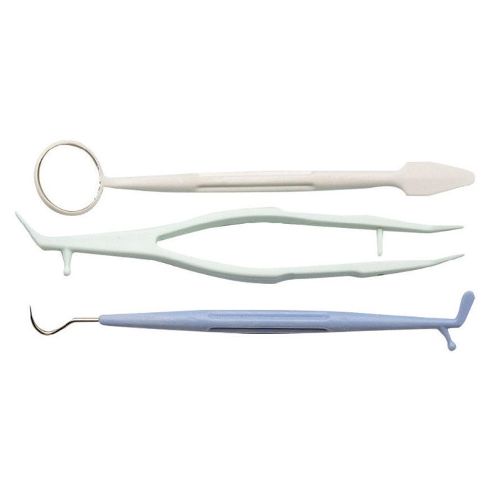 Kit monouso sterile per prima visi ta e piccole otturazioni. Il kit è composto da 3 strumenti do ppi: specchietto/spatola - pinzetta /condensatore - specillo/brunitore.