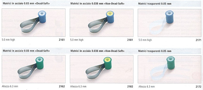 Matrici in acciaio preformate e pre montate per denti posteriori. Spessore 0,038mm (non Dead-Soft), altezza 6,3mm. Confezione da 50 pz.