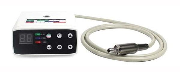 Micromotore per contrangoli di gradevoli dimensioni estetiche, confortevole e versatile nell'uso quotidiano. Consente di poter usare manipoli rapporto 1/1, 1/5 e 1/16con programmi dedicati per ognuno potendo variare velocità e potenza. Doppio senso di rotazione con indicatore luminoso. Giri 2.000/40.000rpm. Dimensioni del manipolo ø 22mm lunghezza 77mm, peso 71g. Dimensioni del dispositivo di controllo 150 X 128 X 55 mm. Peso complessivo 1.250gr.
