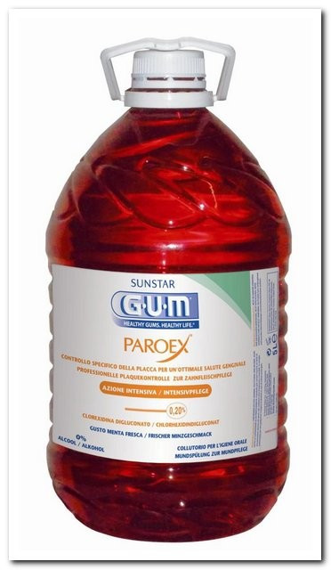 Collutorio alla clorexidina senza alcol, ad azione intensiva. La formulazione senza alcol risulta particolarmente gradita: evita effetti irritanti sulle gengive e spiacevoli senzazioni di bruciore. La Clorexidina è l'antisettico più efficace contro la placca batterica. Il suo lento rilascio (sostantività) è da ritenersi proprietà fondamentale per una protezione più duratura. Il dosatore è da ordinare a parte:codice DT 10020977 PAROEX 0,20% BUTLER SOLO DOSATORE. Tanica da 5 litri, gusto menta fresca.