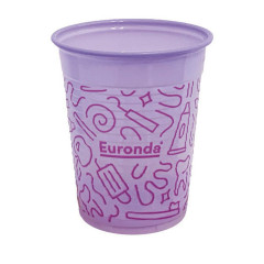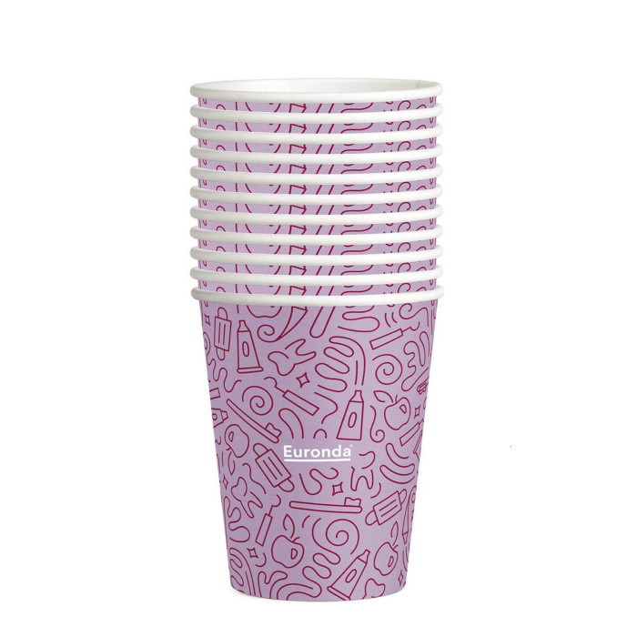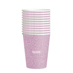 Bicchiere in carta Graffiti. Prodotti in carta provenienti da foreste gestite in maniera corretta e responsabile secondo rigorosi standard ambientali, sociali ed economici (certificazione FSC). La grafica richiama elementi iconici della professione del dentista come mascherina, spazzolino, dentifricio e specillo. Capienza 200 cc. Confezioni da 50pz. Colore: lilla con pattern vinaccia.