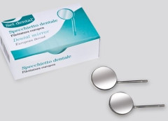 Specchietto dentale non sterile, riutilizzabile, costituito da una cassa in acciaio inossidabile al cui interno è collocata una cornice in silicone sulla quale viene appog giato un disco di vetro precedentemente trattato. Sulla cassa è salda ta una piccola asta con filettatura che ne consente l'avvitamento ad un manico. Da sterilizzare prima dell'uso. Confezione da 12 specchietti di ti po rodio, misura 4, filettatura Europea.