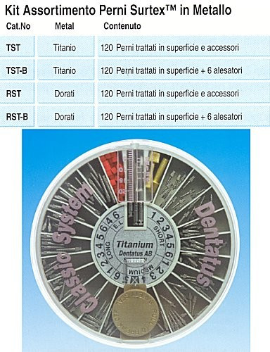 Il kit comprende: 1 chiavetta cava1 chiavetta a croce - 20 stoppers -120 perni dorati. Perni dorati pre-trattati: non occo rre mordenzarli o sabbiarli. Presentano una particolare struttur a superficiale irregolare che ne aumenta l'area di contatto,creando una ritenzione notevolmente migliore rispetto al perno tradizionale. Tale tipo di superficie rispecchia meno la luce ed evita l'effetto omb ra che si verifica con i compositi translucenti, garantendo così un mi gliore risultato estetico.
