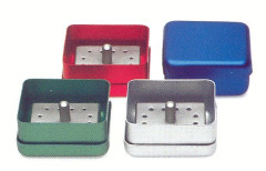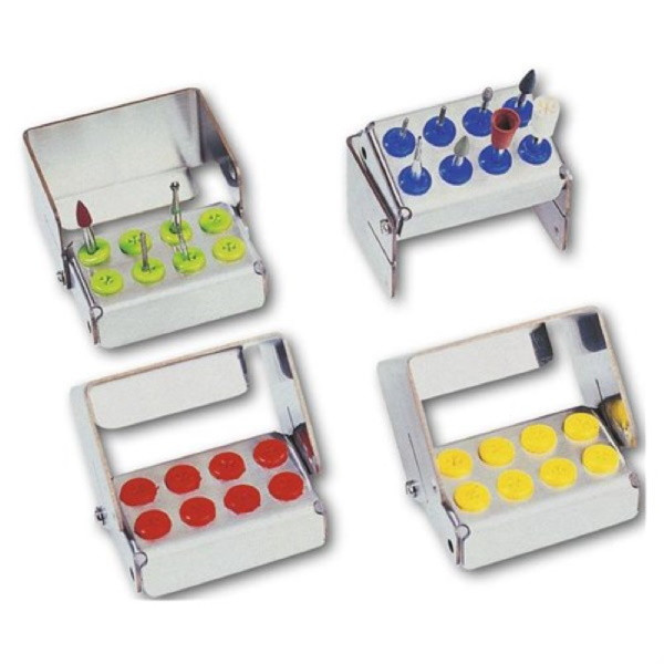 Portafrese in acciaio inossidabile dotato di 8 fori con innesti in silicone colorati. La copertura può essere rotata per porgere le frese in orizzontale o inclinate. Supporta qualsiasi combinazione di frese FG o RA quale che sia il loro diametro. Dimensioni: 4,5 x 2,5xh 3cm. Colore inserti: verde.