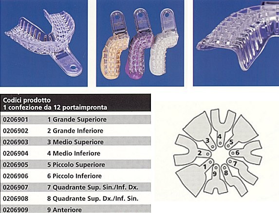 N 4 - Medio Inferiore. Portaimpronta trasparente in materi ale plastico riciclabile- monouso -struttura perforata - spessore unif orme e arrotondato - si può modificare ammorbidendolo col calore - co mpatibile con tutti i tipi di materiale da impronta.