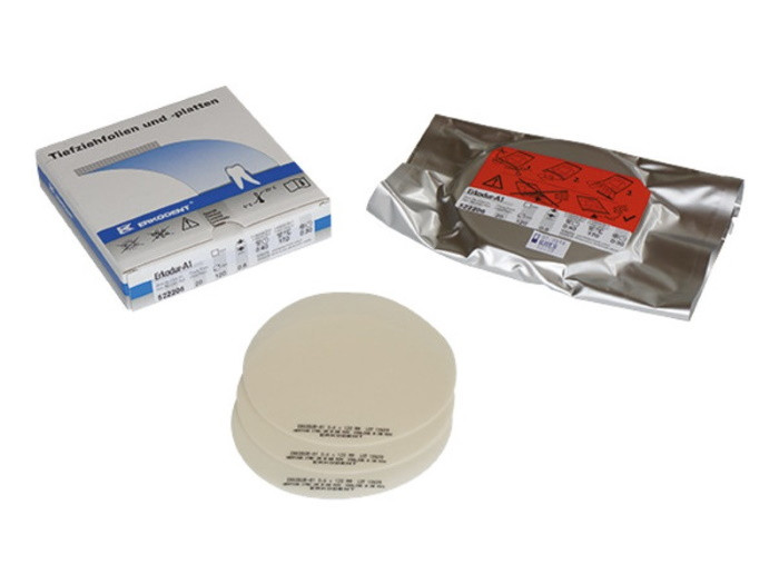 Materiale duro molto resiliente, colore dente, copoliestere (PETG), con foglio isolante per la realizzione di bite occlusali, docce di bruxismo, docce cosmetiche, per mascherare inestetismi delle arcate , provvisori e Silensor-sl. Diametro 120mm. Confezione da 20 dischi.