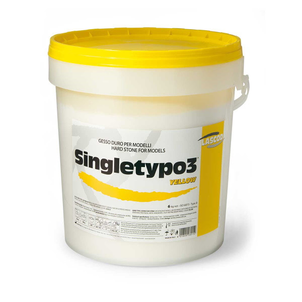 Gesso dentale tipo 3 (duro) extrafine per lo sviluppo di antagonisti , modelli Master in protesi mobile, parziale, scheletrata, modelli studio e preliminari. L'altissima precisione nel rilevamento del dettaglio, la resistenza all'usura, la bassa espansione, il tempo di presa rapido, fanno del Singletypo3 un gesso in grado di soddisfare tutte le esigenze del professionista del settore. E' compatibile con tutti i materiali da impronta e liquidi isolanti, e non lascia residui sul manufatto. Fusto da 6 kg colore giallo
