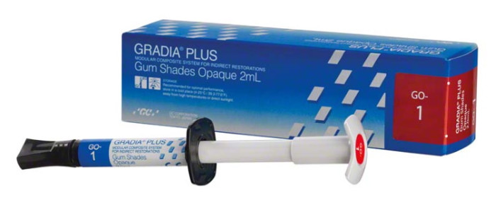 GC GRADIA PLUS è un composito nano -ibrido fotopolimerizzabile con eccellenti proprietà fisiche e una migliorata estetica rossa e bianca che si presta a un'ampia gamma di applicazioni cliniche grazie alle caratteristiche di durata insuperabile, opalescenza naturale, estetica e realismo dei risultati che lo contraddistinguono. GUM Shades Opaque in pasta ha eccezionale caratteristiche di fotopolimerizzazione e copertura. Si applica immediatamente, è fluido ma non gocciola e non cola. La confezione contiene 1sirinda da 2ml colore OPAQUE GO-2.