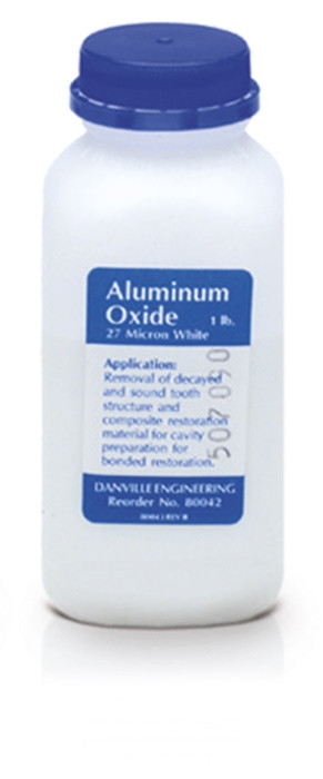 Polvere abrasiva di ossido di alluminio, granulometria 27 micron. Indicata per la preparazione di cavità e superfici adesive. Uso generale su superfici metalliche e non, ceramica e acrilico. Flacone da 450gr.