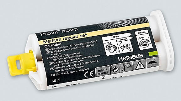 Materiale da impronta in polivinils ilossano per tecnica simultanea,dop pia impronta, da utilizzare con di spenser manuale. Garantisce una cos tante ed affidabile precisione d'im pronta, durezza bilanciata, stabili tà dimensionale. Viscosità regular, presa regular. La confezione contiene 2 cartucce x 50 ml + 6 puntali miscelatori gialli.