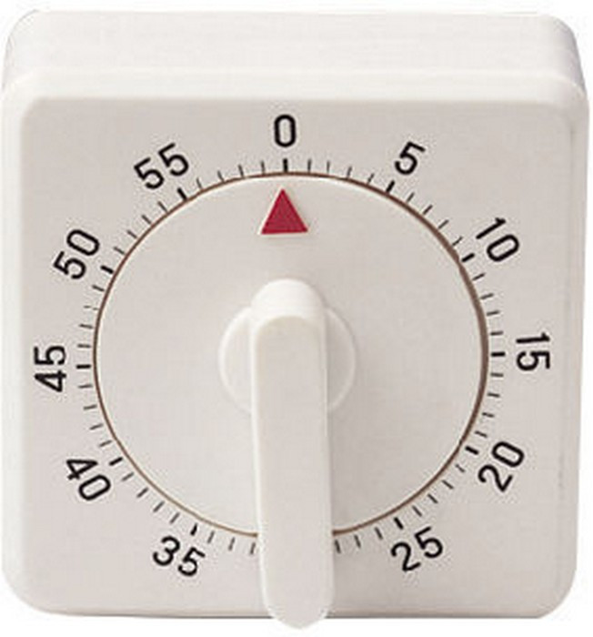 Timer con movimento meccanico, scal a a 60 minuti e segnale acustico lo zero. E' provvisto di sostegno a muro. Dimensioni: 60 x 28 x h 6m. 1 pz. m. 1 pz.
