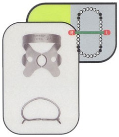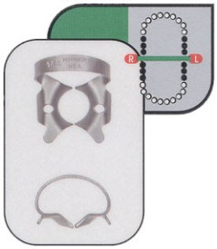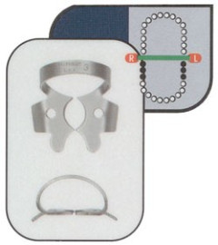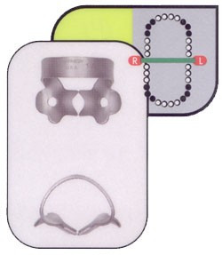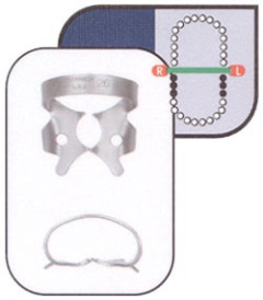 Uncino per diga, con ali, in accia io con trattamento antiriflesso, per radici premolari superiori e in feriori.