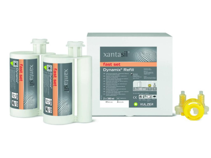 Materiale a base siliconica a media viscosità, indicato per la presa di impronte anatomiche per relizza zione di provvisori, antagonisti, modelli ortodontici, splintaggi. La confezione comprende: 2 siringhe da 380ml , 2 puntali miscelatori, 1 anello di fissaggio.